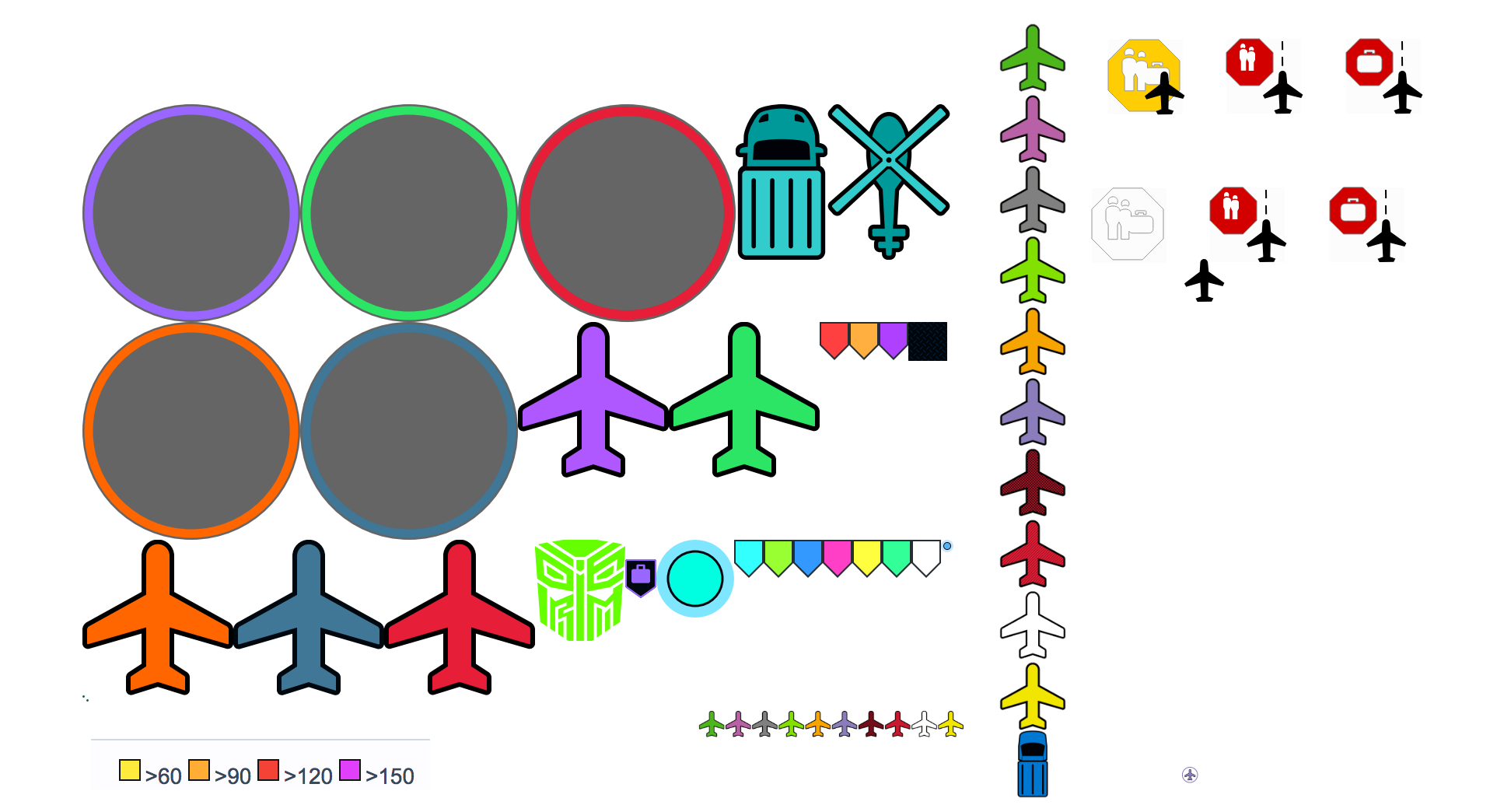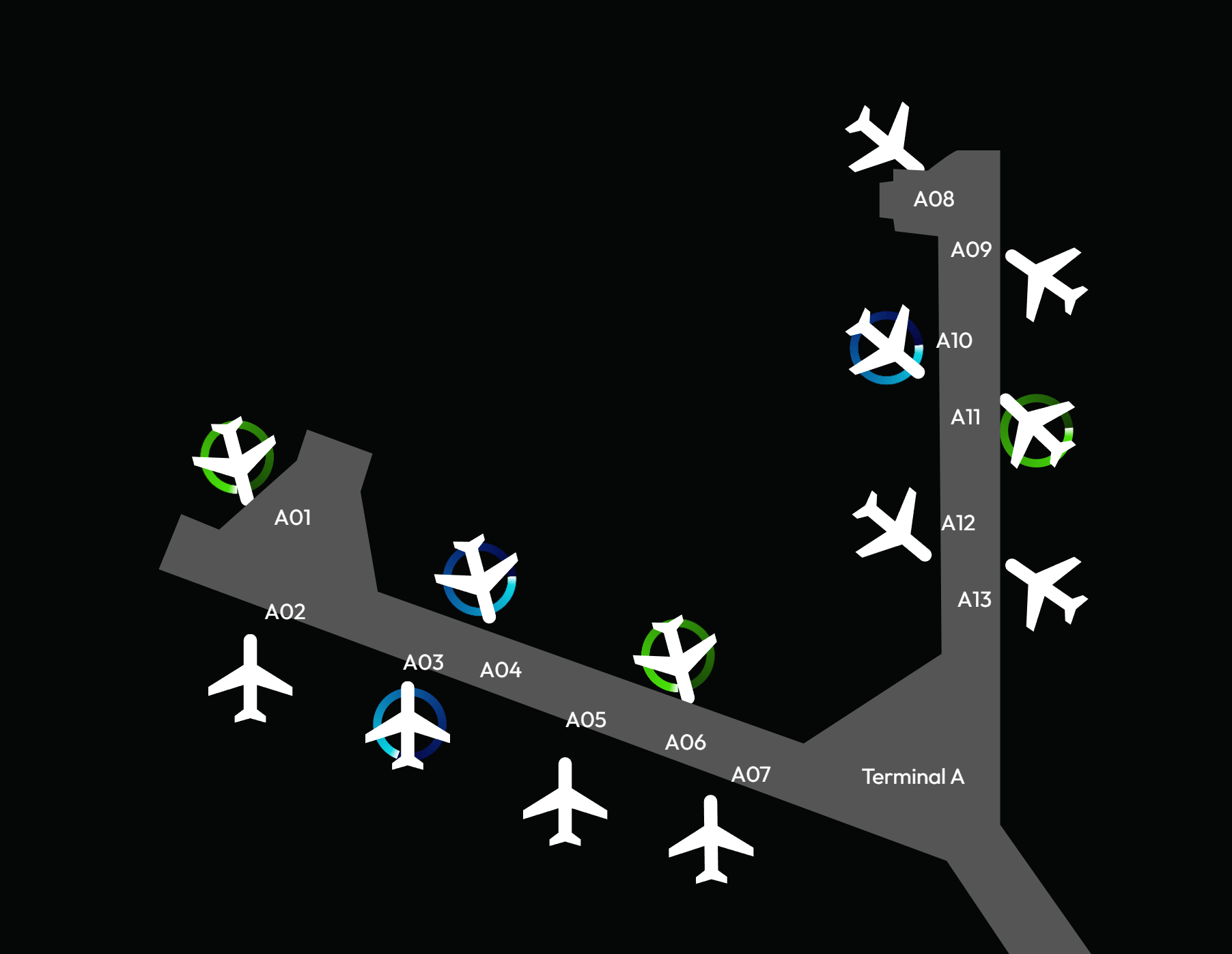 Flights in green are ready to depart, blue are waiting for deicing, white are waiting, red indicates that the flight has been cancelled at the gate.